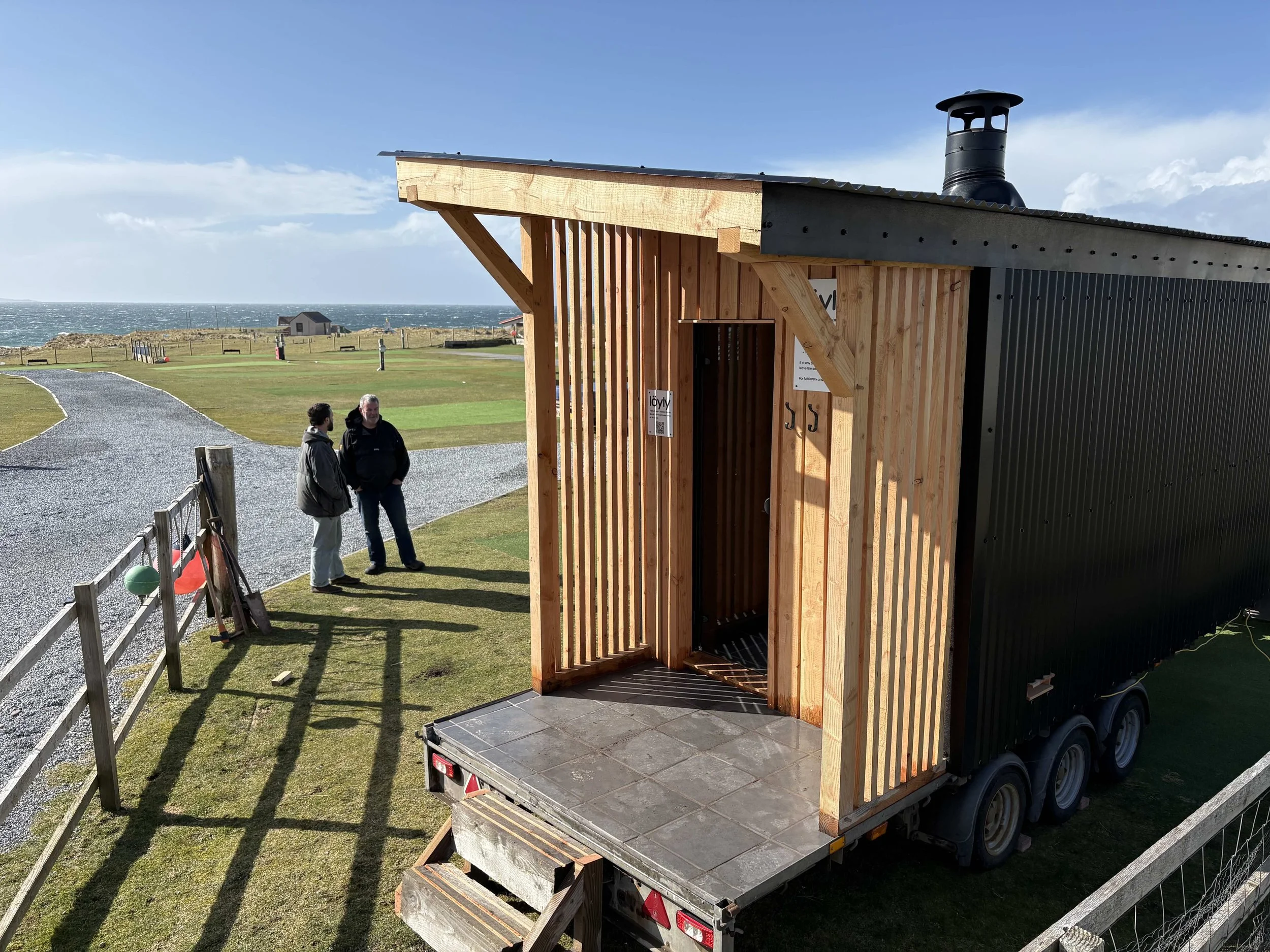 Mobile wood-fired sauna at Clachtoll Beach, NC500 ·